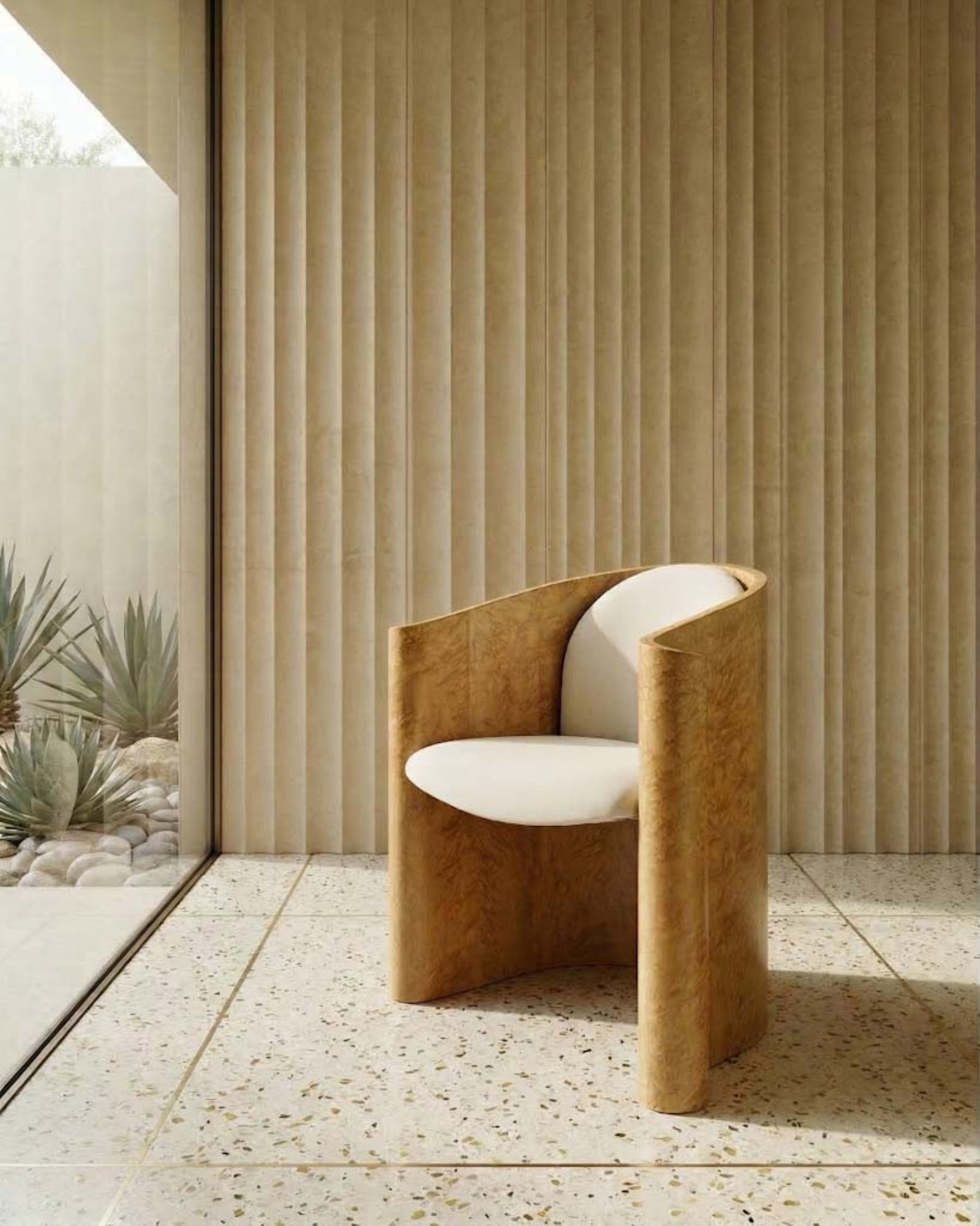 Its softness is balanced by visual weight. The uninterrupted surface pouring directly onto the floor is a feast of materiality, and yet this monolithic form is built lightweight, giving it the utility of a dining chair.